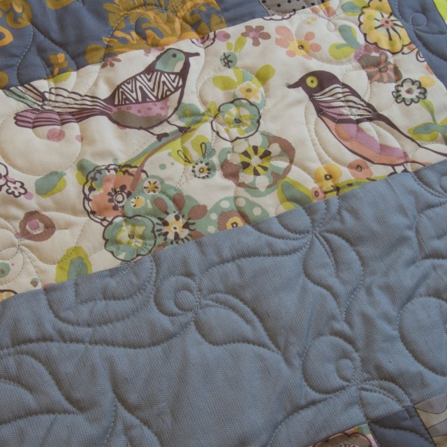 I quilted it with a loopy flower design called “button flower” that I thought suited the bird print I love on the quilt.