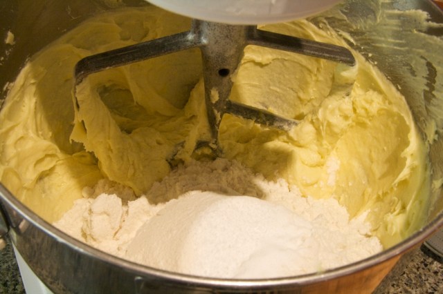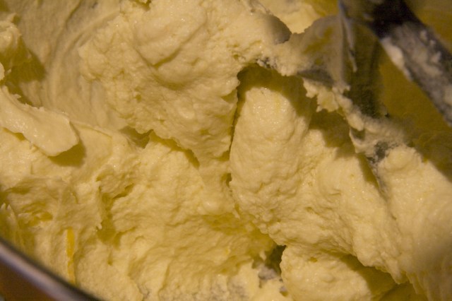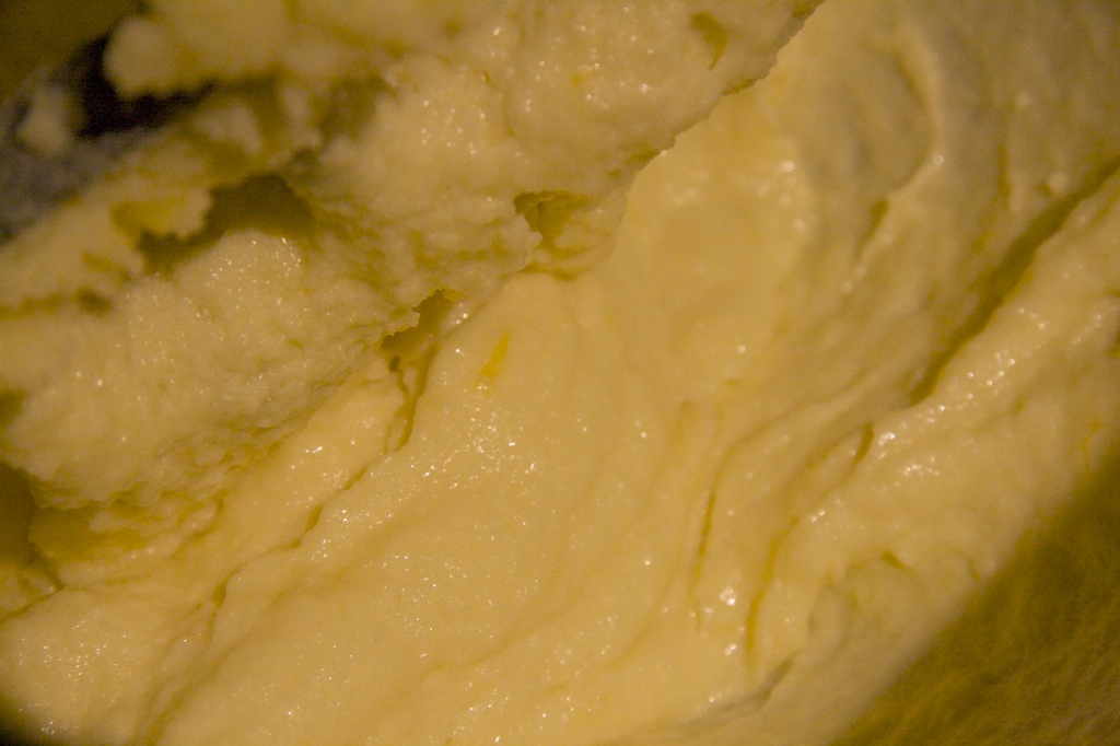 Cream butter and sugar and the grated lemon zest until light and fluffy. This here means you need to have the butter at room temperature. If the butter is too cool, it’ll be hard, and you’ll be beating until it warms up to room temperature which will drive everyone in the house crazy because you’ll be running the beater a long time.