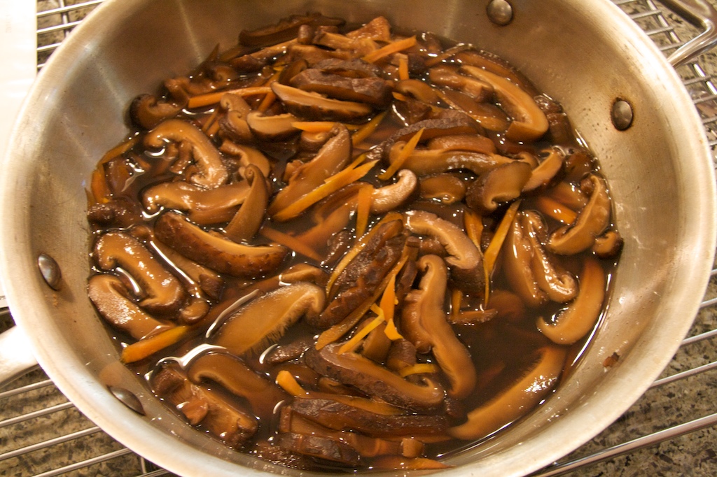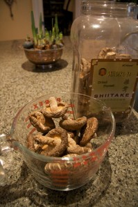 - Dried Shitake Mushrooms – 16 to 20 pieces soaked in hot water to cover (I used about 4 cups of water. Save the soaking water) Soak them until they are at least soft enough to slice.