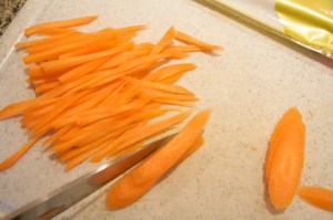 Cut off the woody stem of the mushrooms and discard that part. Cut the soaked mushroom caps into about 8 to 10 slices each. Simmer mushroom slices, carrot, soy sauce, sugar, and five spiced powder in the mushroom soaking water. Stir and simmer for about 7-8 minutes until the mushroom slices are translucent. Set aside.