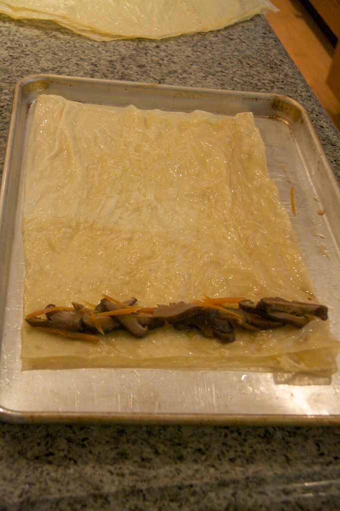 Lay one of the tofu sheet packets on the jelly roll pan and spoon some of the cooked mushroom slices ( you will be dividing this into 8 parts) and sauce onto the tofu in a line along the narrower end (the 7” end) of the tofu.