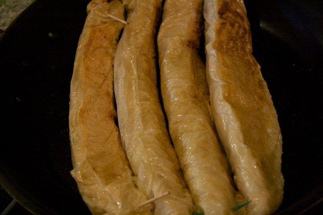 Continue to make 8 rolls. 4 rolls fit in each frying pan. Do not discard the remaining mushroom cooking liquid.