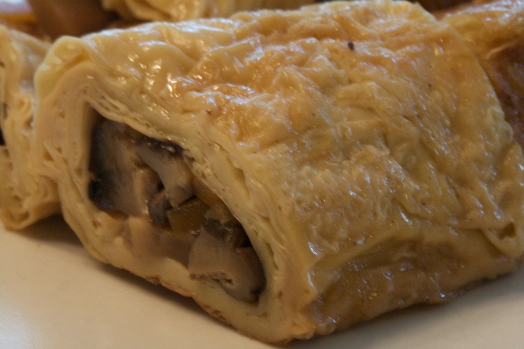 Roll the tofu up over the mushroom mixture encasing it in the roll. This should result in a roll about 1-1/2”x7”. Secure with a toothpick on at each end of the rolls to prevent unrolling.