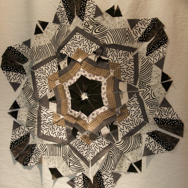 The kaleidoscope bits are cut and starting to come together on the design wall.  I noticed laying out the bits and pieces, there is a lot of wastage in the strata layers of fabric.   Being the sort that tries to use every scrap (That’s the point of quilting, right?), I can’t throw out all the funny shaped pieces remaining after cutting the pieces out.  So…. I’m laying out a second smaller star/kaleidoscope with some the fabric strata leftovers.  I’ll lay that out later.