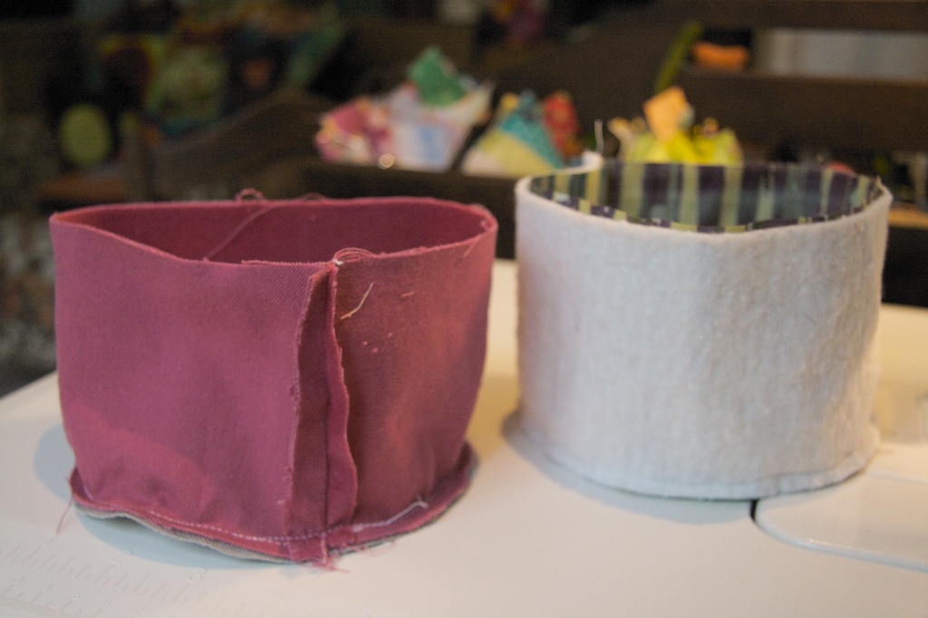 Sew around the top lip of the cylinders with a 1/2″ seam, backtacking at the beginning and end of this seam and leaving a 3″ opening to turn everything right side out again.