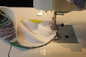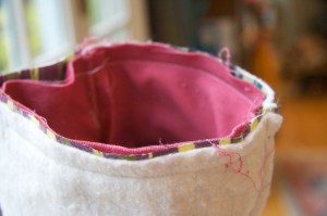 Top stitch around the top edge through all the layers to close and finish off the lip of the bowl.  Top stitch again around the bowl through all layers 1″ down from the top.