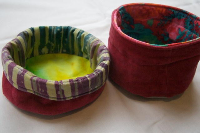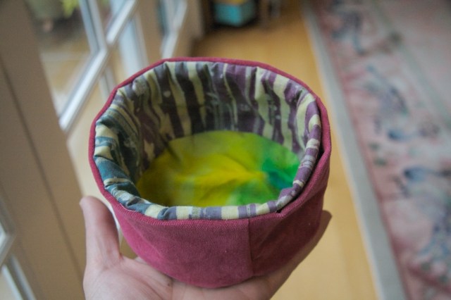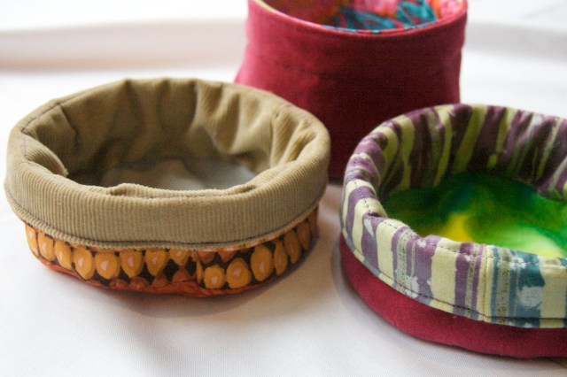 You can flip the top down or up depending on how deep you want to bowl to be. The bowls are reversible, but if yours are like mine, they seem to prefer to have the heavier weight fabric on the outside.   Use the fabric you have.  Here’s one with corduroy.