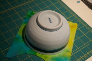 For a 5-1/4″ wide bowl you need about 16″  inches on the strips. If you want to be exact about how long the strips need to be, you’ll need to go back to junior high school geometry and use the formula Circumference= Pi times Diameter.  Only since you’ll be taking a 1/4″ seam allowance, the diameter you should use is 1/2″ smaller than the actual measured diameter. (1/4″ is taken from all sides so the diameter decreases by 1/4″ times 2)