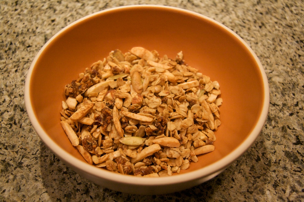 The important thing to keep in mind while substituting is that some things stand up to baking longer than other things. Things like raisins, dried cranberries or chopped dried apricots, for instance, should be added later in the baking/browning period than dates or they’ll get hard and weird. And hard and weird is disconcerting in an otherwise great granola.