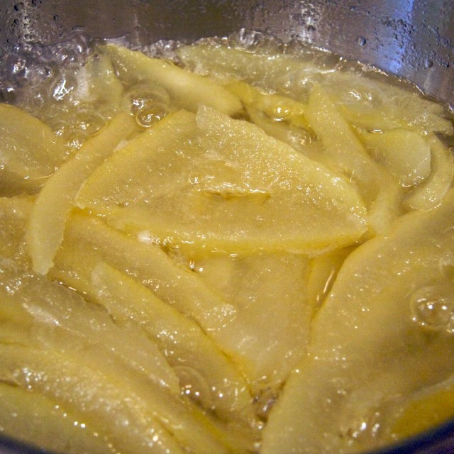 But then I followed the same recipe with a lemon and made candied lemon peel, the only difference being that I trimmed much more of the white pith off.  Those were awesome – lemony, tart, sweet, intense.  We’ve consumed almost all of it in two days.