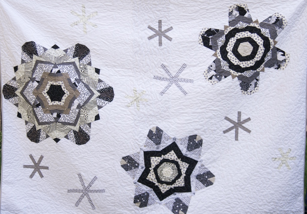 While not perfect, the first photo lets us see the additional snowflakes, a nice mixture of light, medium and dark in different sizes. Spaceship photo is kinda cute 🙂 I think you are right about the quilting. It works!