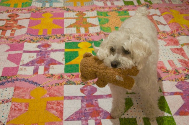 I’m told that dogs don’t see color, but I believe that the colors in this quilt makes both of us happy.