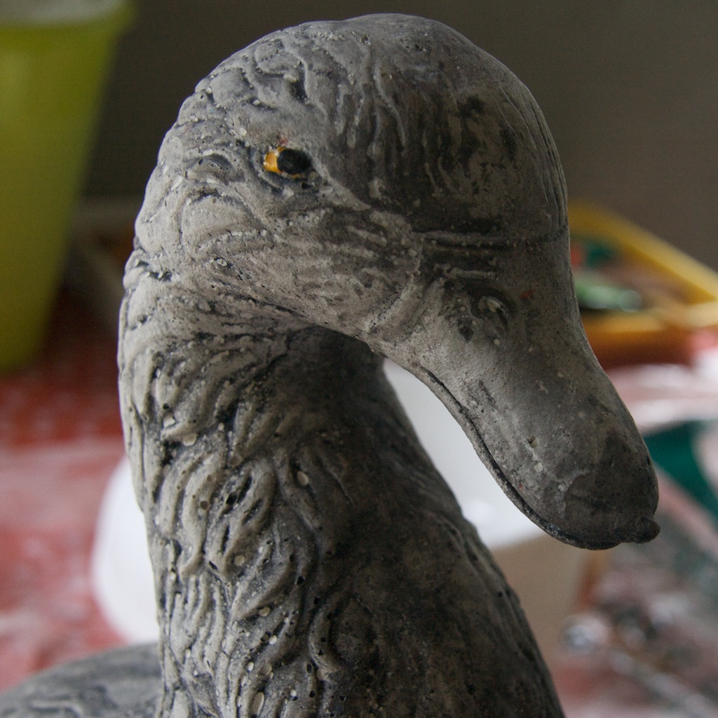 Who decided that painting these eyes on this cement duck lawn ornament was a good idea?