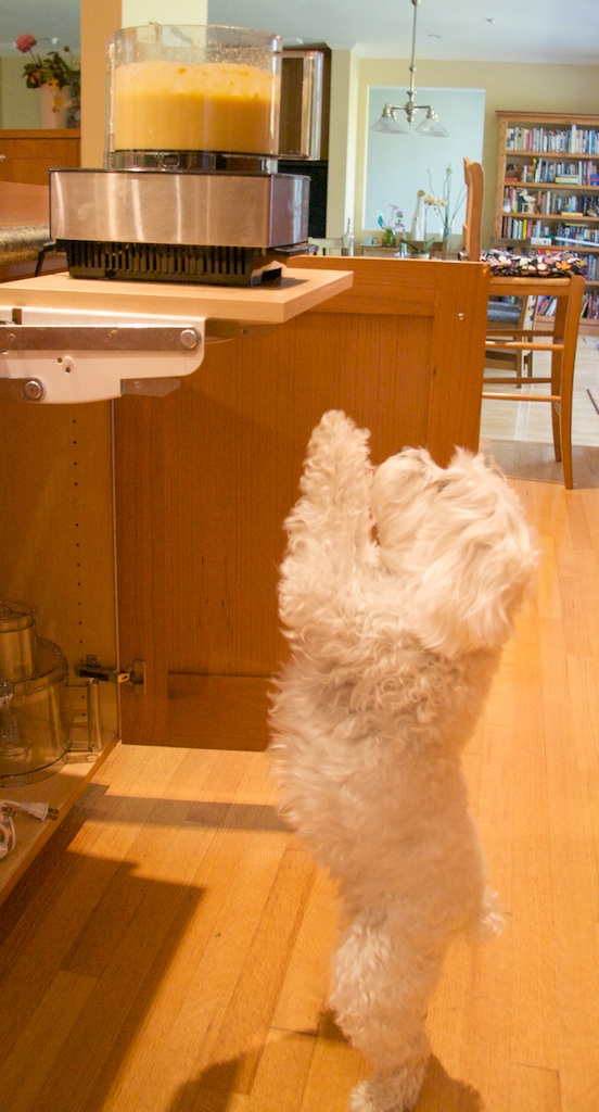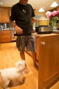 Divide batter into 24 cupcake tins lined with papers. We use one of those squeezy ice cream scoops to try to contain the mess and divide things evenly and filled the cups about 3/4’s full. Bake at 350 degrees for 20 minutes or so or until a toothpick comes out clean. Note that these do not rise particularly high. Cool them before frosting. Do not feed any cupcakes to the begging dog.