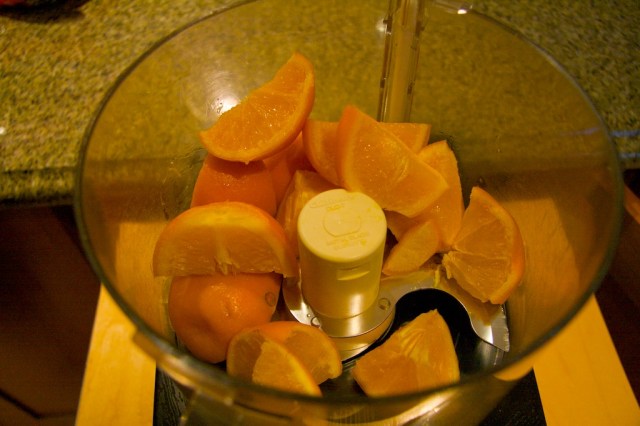 When the oranges are cool, cut into quarters, remove the stem end of the orange and if there are any large pithy parts or obvious seeds, remove and discard those. Cut the orange quarters in half again and blend them in a food processor until throughly blended, peels, insides, pith and all.