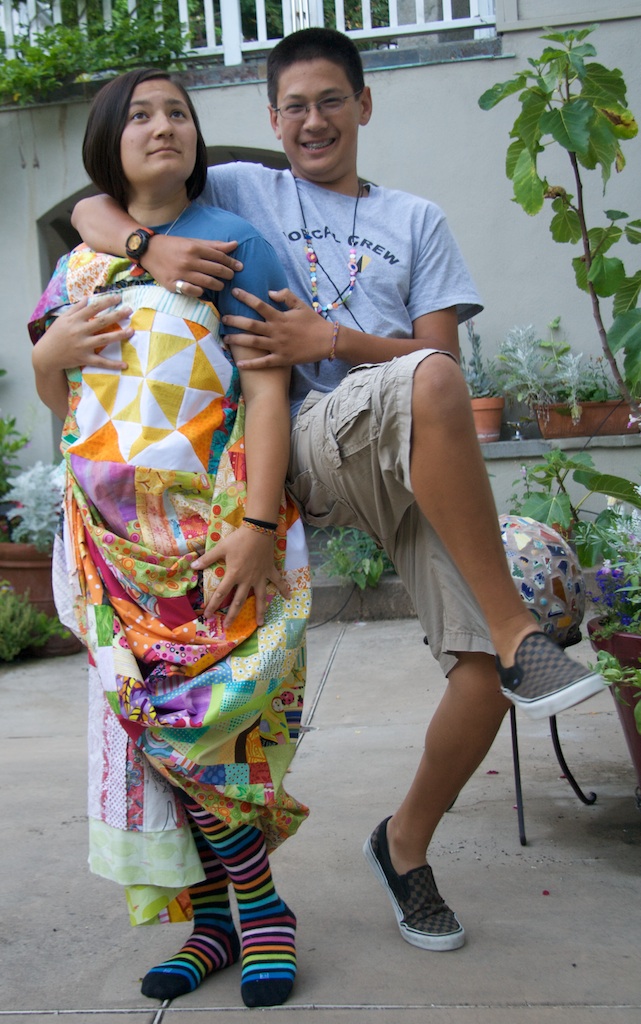 See, I take full big pieces of fabric and cut it into smaller pieces. Some of those pieces are sewn together in what is hoped are pleasing combinations. Other pieces are discarded or jammed into the scrap pile.  The kids, the quilt