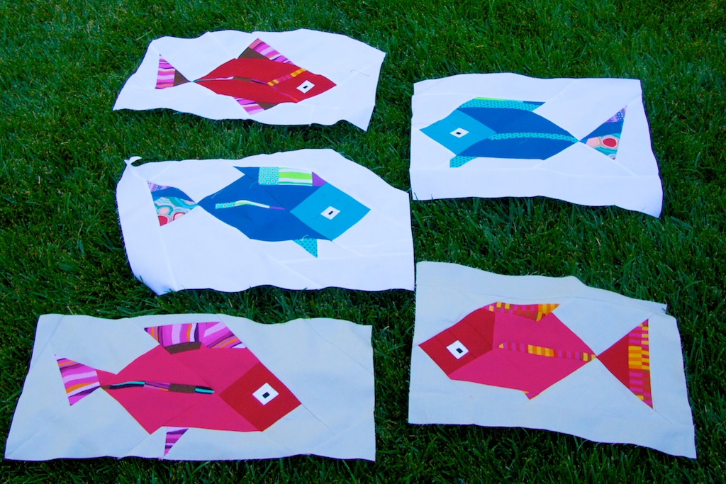 Improvisational FishThis fishing trip started with being inspired by improvisational quilting and liberated quilt making.  Gwen Marston and Freddy Moran make eye poppingly bright quilts together and I had the privilege of seeing some of them up close and personal once. They’re so full of energy! (Both the quilts and quilters come to think of it.)