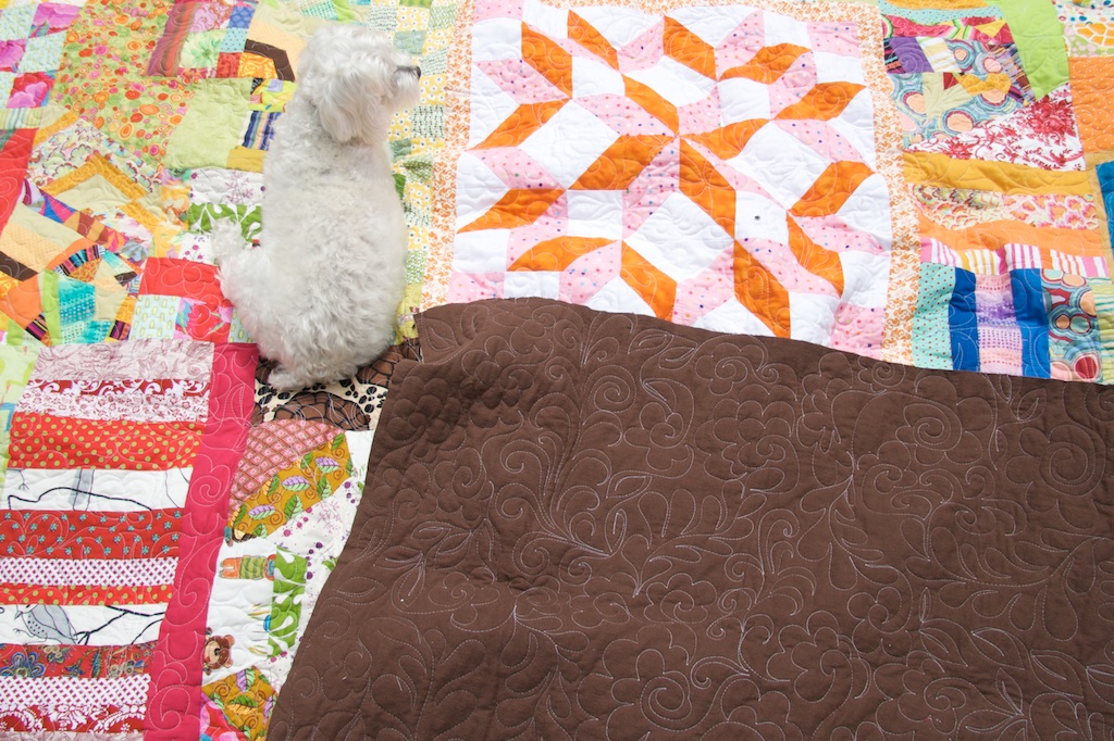 Sadly, there’s no plain backside on the crazy scrap quilt. It’s about as busy as the front only with bigger pieces. If you look closely, you can see the quilting…sort of. I think I did the crazy floral mish-mosh mostly to get my doodle urges out.