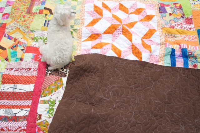• AND I could make a quilt for Schnap-the-Co-Quilter so that she could sit on and enjoy it without me yanking it out from under her. (Seriously, this has become a game for her now. Schnap sits on quilts and swatches and I try to yank them out from under her sort of like the magicians trick of pulling a tablecloth out from under a fully set table.)