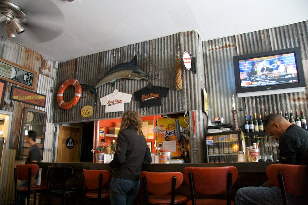 The clientele are working folk – guys with safety vests, hard hats and steel-toed boots eat lunch here, some staring at the sports scores on the TV above the bar, and others in groups.