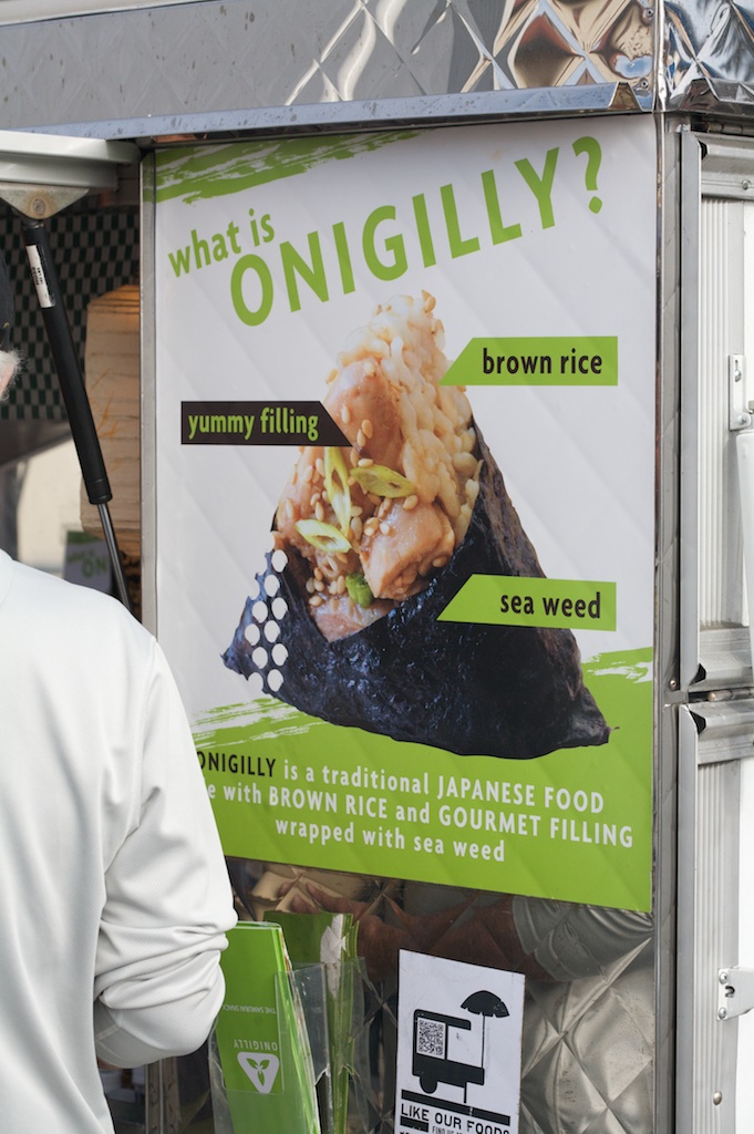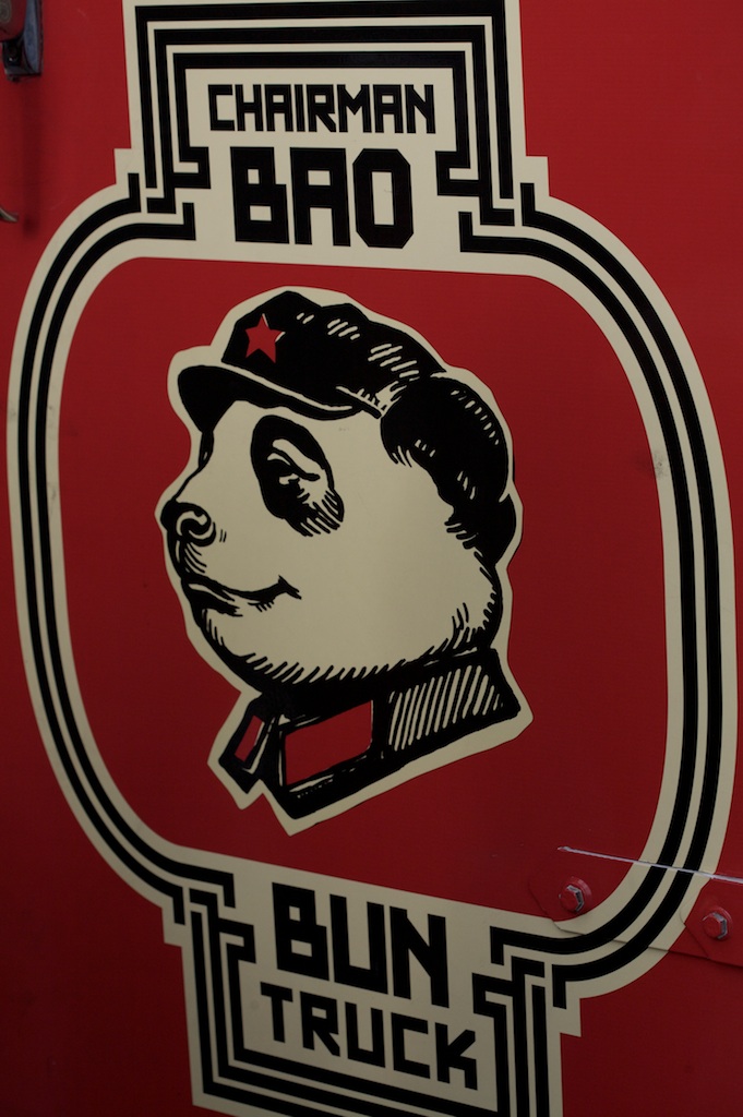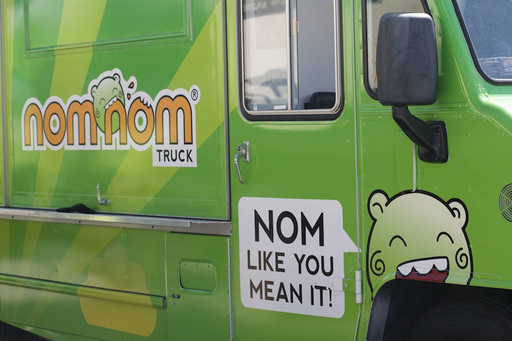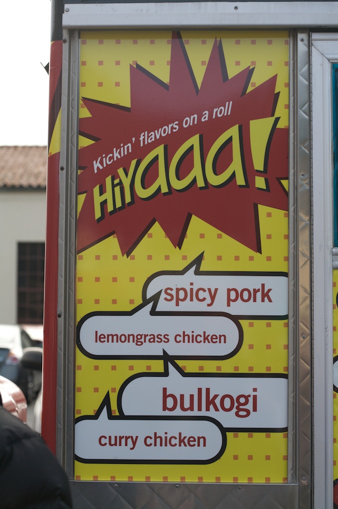 The formula consists here of Asian fusion food, sold out of a highly decorated truck painted in bright colors, with a cheeky play on words in the business name….A long long way from ‘roach coaches’.