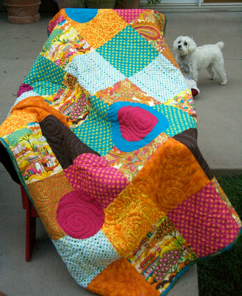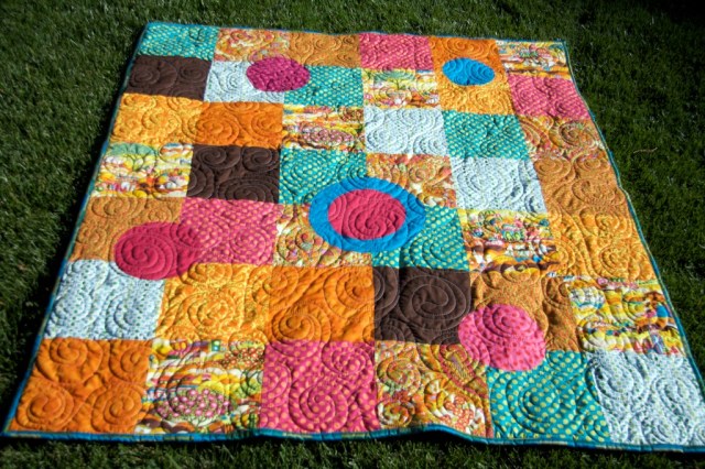 I made a quilt top with big honking pieces. 9-1/2″ squares.  Big enough to get big motifs from the very cool artwork in.  Then we added coordinating solids, and some of my stashed away spots.  I thought I was finished and ready to quilt it but it looked dorky. The whole mess was about to go back to the Island of Misfit fabrics and unfinished objects, but then…Schnap the Co-Quilter dragged a nearby Frisbee onto the quilt. Co-Quilter knew what to do. Bigger spots! We cut and inserted bigger spots into the top. Ta da! Travel spots…Complete with spots big and small.