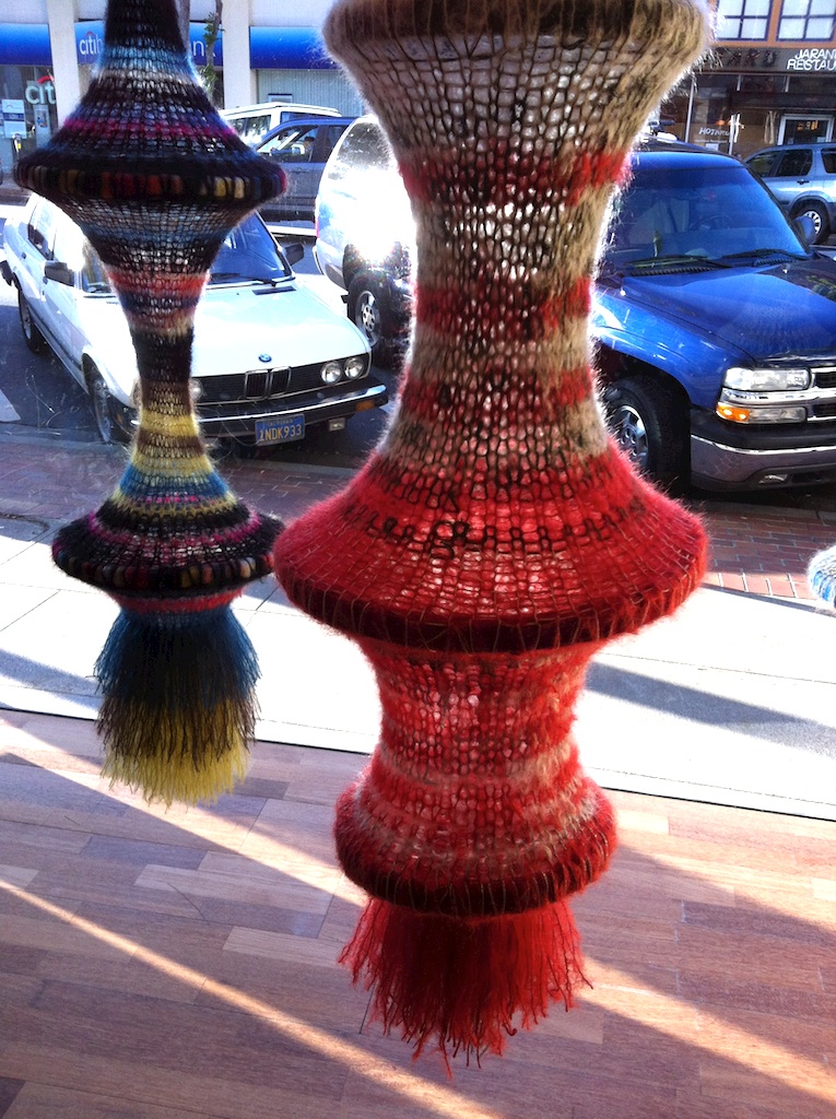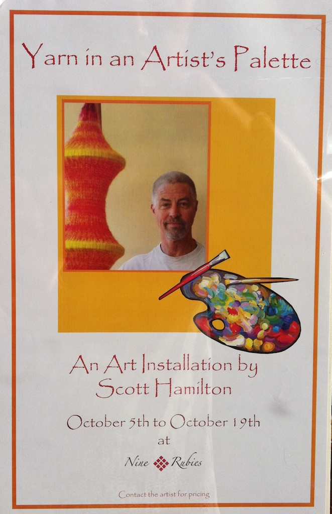Fiber and color will always stop me in my tracks. I saw this installation in the window of Nine Rubies, the local yarn store,screeched to a halt, and ran in to take pictures.