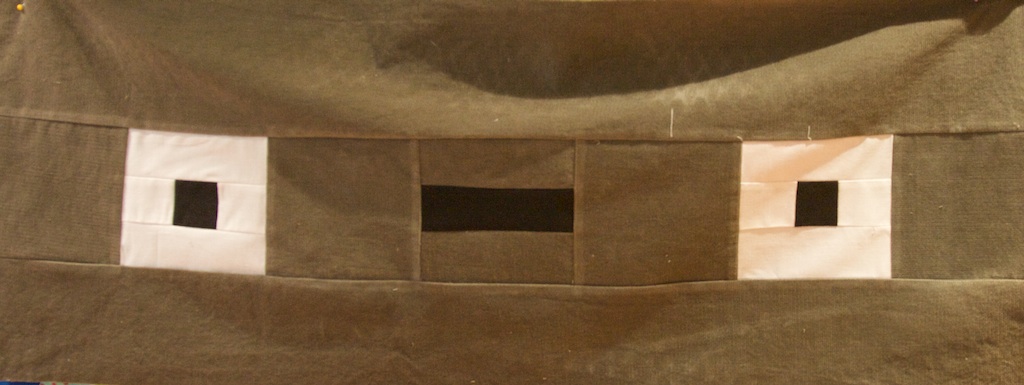 We’re on corduroy countdown to 11/11/11, so I’m making a quilt out of corduroy. I liked this dusty brown corduroy I saw at Joann’s. It reminded me of a forest creature named Totoro. Totoro is a fuzzy guy so it seems appropriate to piece him in corduroy. I’ve pieced him before in Kona Cotton here, but piecing him in corduroy is slightly different because of the nature of the fabric.