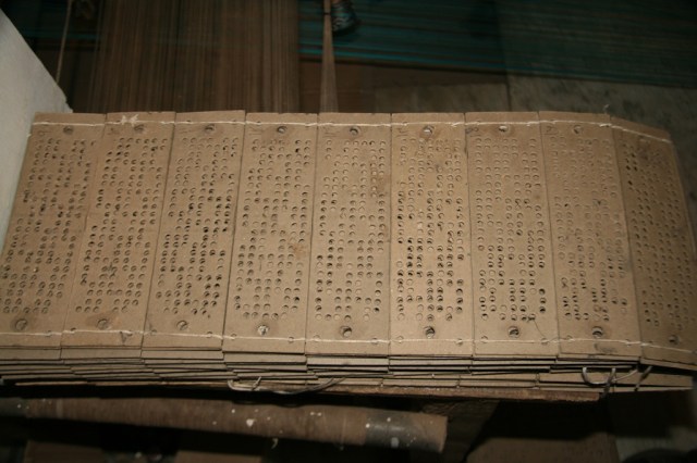 The Jacquard Loom was invented in the early 1800’s and drastically simplified making wovens with textures. The cards with the holes in them determine which threads are going up or down.